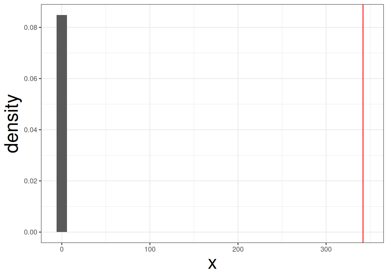 We can see that red line is clearly far away from the null distirbution. Therefore, body mass is affeced by species of penguin. We can compute the p-value with the following code: